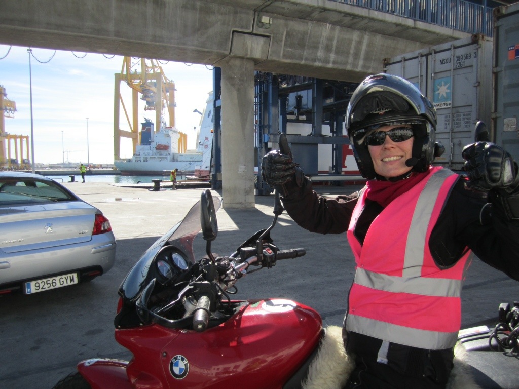 The first thing we did was to put the mirrors back on and rewire the batteries which had been neutralised for the transport. We then filled in our tanks with the two 5L jerrycans we had brought with us and tried to start the bikes. Louise’s started straight away, as if it hadn’t been sitting empty and neglected in Africa for 6 weeks. Mine, on the other hand, didn’t make a sound. I was expecting that the cheap Chinese battery I had bought in Tan Tan would not last long and it hadn’t. To be fair, it had performed flawlessly between Tan Tan and Banjul so I couldn’t complain. The 6 weeks wait did kill it though. Lloyd and his staff were very helpful in trying to jump start it and push starting but it was obvious that I needed a new battery. Luckily enough there was a motorcycle dealer a few hundred meters away so I jumped on the back of Louise’s bike and we purchased a brand new, quality, Yuasa battery. After all, my F650 deserved a treat. She obviously appreciated the gesture and fired up instantly. It was a great feeling to be back on the bikes, in our yellow and pink hi-viz. I was again surprised at how good these BMWs are. So easy to work on and the level of comfort they provide for a 650cc single is incredible.
